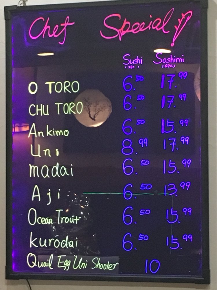 3pcs,each of Toro, bluefin tuna,salmon,yellowtail, kampachi,unagi,madai,albacore Includes miso soup and salad.