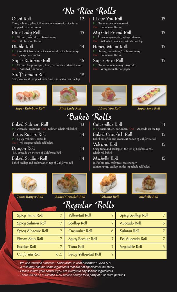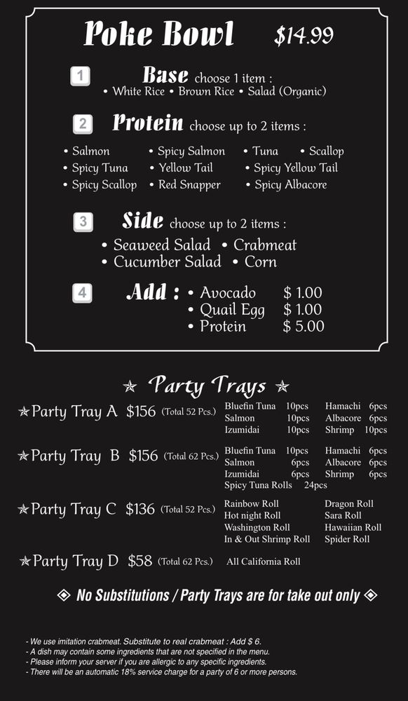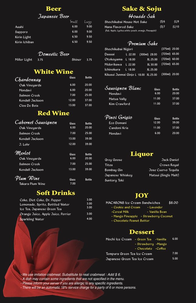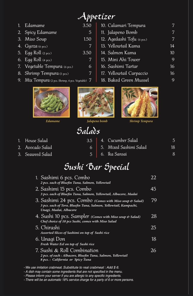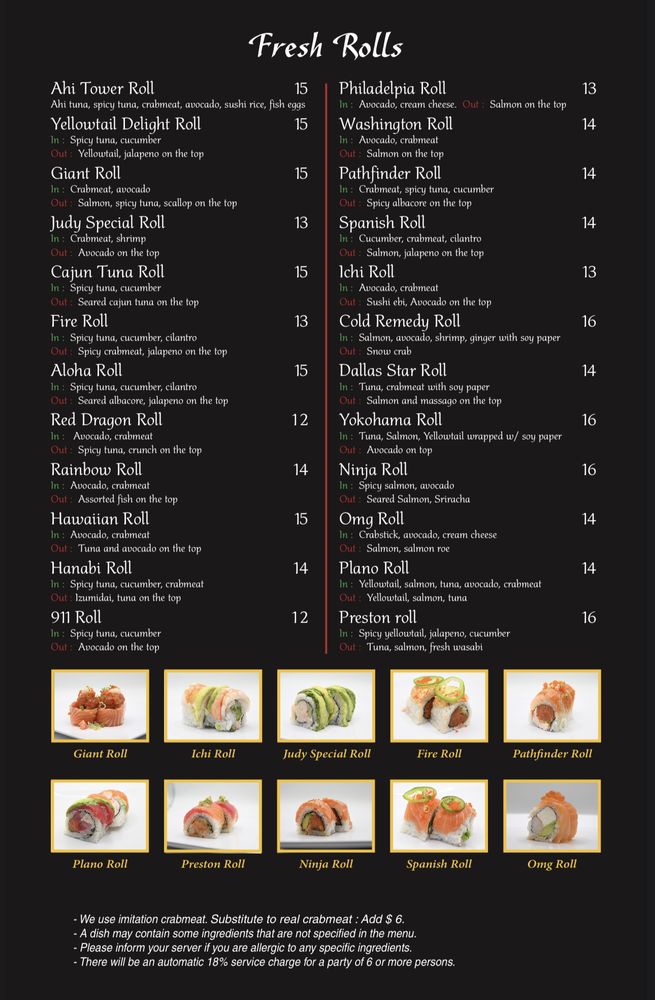 Introducing the menu at Sushi Yokohama, located in Dallas, TX, where authenticity meets innovation in every dish. This casual yet cozy spot offers a wide range of delights, from traditional sushi rolls to unique appetizers like Jalapeno Bombs and Mini Towers. Delicious options include the Salmon Roll, Giant Roll, and Avocado Salad, all prepared with premium ingredients and served in generous portions. Customers rave about the exceptional service and the vibrant atmosphere, making it a must-visit spot in North Dallas. With options for all preferences, including vegan and vegetarian choices, Sushi Yokohama caters to every palate. Don't miss out on the Happy Hour specials, full bar, and the option for private dining. Experience the best of Japanese cuisine at Sushi Yokohama today.